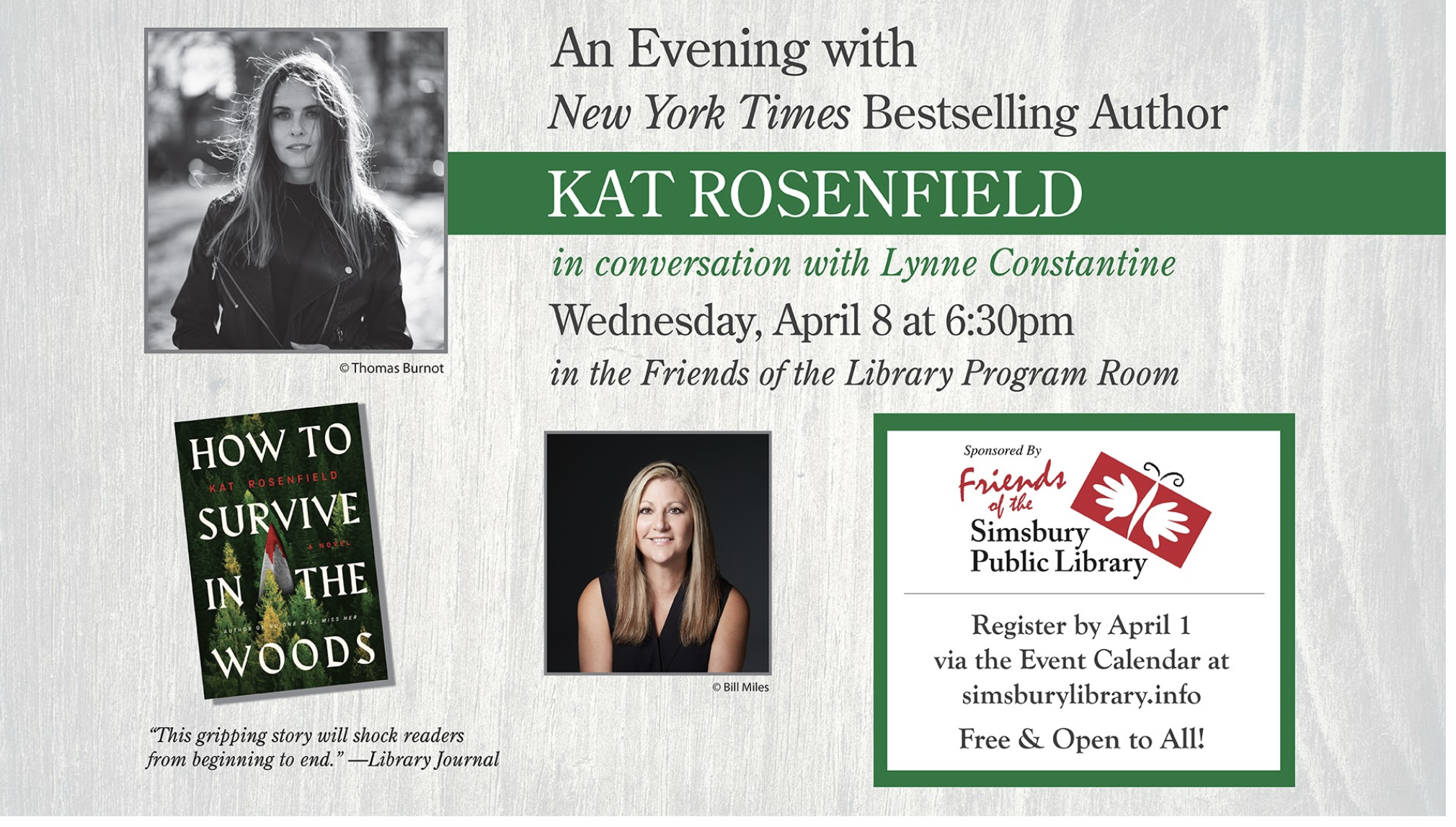 Simsbury Library 725 Hopmeadow Street, Simsbury, CT, United StatesNew York Times bestselling author Kat Rosenfield will join the Friends on Wednesday, April 8 from 6:30-8 p.m. in the Friends program room to discuss How to Survive in the Woods, her soon-to-be published thriller novel. She will be in conversation with New York Times bestselling mystery author Lynne Constantine. Set in Maine's Hundred Mile Wilderness—the treacherous…